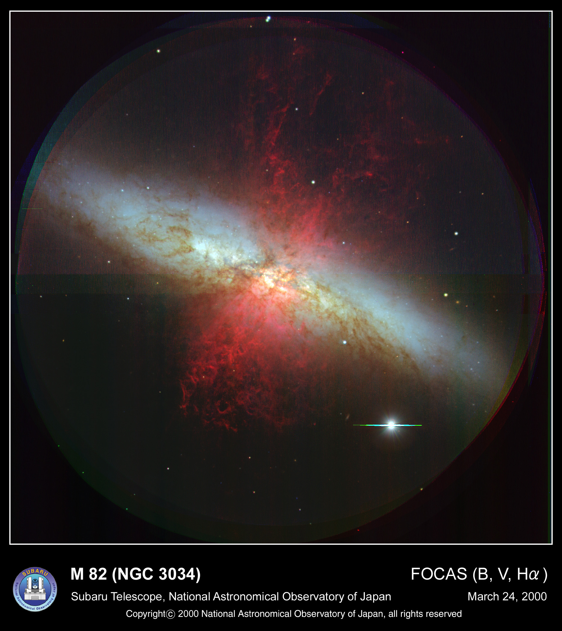 ¿Qué ilumina a la Galaxia Cigarro? M82, como también se conoce a esta galaxia irregular, fue perturbada por un reciente paso cercano a la gran galaxia espiral M81. Sin embargo, esto no explica completamente la fuente del gas de color rojo que se expande hacia el exterior. Evidencias recientes indican que este gas está siendo impulsado hacia afuera por los vientos de partículas combinados de muchas estrellas, creando juntos un "superviento" galáctico. La fotografía publicada recientemente por el nuevo Telescopio Subaru destaca el color específico de la luz roja emitida intensamente por el gas de hidrógeno ionizado, mostrando filamentos detallados de este gas. Los filamentos se extienden por más de 10.000 años luz. La Galaxia Cigarro, situada a 12 millones de años luz de distancia, es la galaxia más brillante del cielo en luz infrarroja y puede observarse en luz visible con un pequeño telescopio en dirección a la constelación de Osa Mayor.