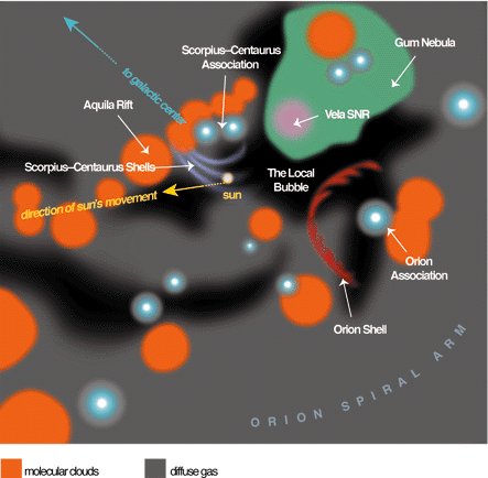 What surrounds the Sun in this neck of the Milky Way Galaxy? Our current best guess is depicted in the above map of the surrounding 1500 light years constructed from various observations and deductions. Currently, the Sun is passing through a Local Interstellar Cloud (LIC), shown in violet, which is flowing away from the Scorpius-Centaurus Association of young stars. The LIC resides in a low-density hole in the interstellar medium (ISM) called the Local Bubble, shown in black. Nearby, high-density molecular clouds including the Aquila Rift surround star forming regions, each shown in orange. The Gum Nebula, shown in green, is a region of hot ionized hydrogen gas. Inside the Gum Nebula is the Vela Supernova Remnant, shown in pink, which is expanding to create fragmented shells of material like the LIC. Future observations should help astronomers discern more about the local Galactic Neighborhood and how it might have affected Earth's past climate.