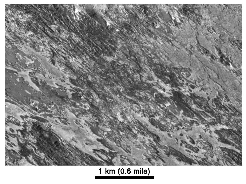 Arriba se muestra la fotografía de mayor resolución jamás tomada de la luna más singular del Sistema Solar. La superficie de Ío, luna de Júpiter, alberga violentos volcanes tan activos que logran renovar completamente el interior de la luna. La fotografía muestra una región de cuatro kilómetros de extensión y permite distinguir detalles de apenas cinco metros. Muchos de los elementos revelados aún no se comprenden del todo. En general, las zonas más brillantes corresponden a terrenos más elevados que las oscuras, aunque algunas áreas de la superficie parecen haber sido erosionadas por un proceso desconocido. Si bien las zonas de la superficie de Ío cercanas a los volcanes en erupción alcanzan temperaturas suficientes para fundir la roca, la mayor parte de Ío se ha enfriado muy por debajo del punto de congelación del agua. La nave espacial robótica Galileo capturó esta imagen en febrero del año 2000 durante su sobrevuelo más reciente de Ío.