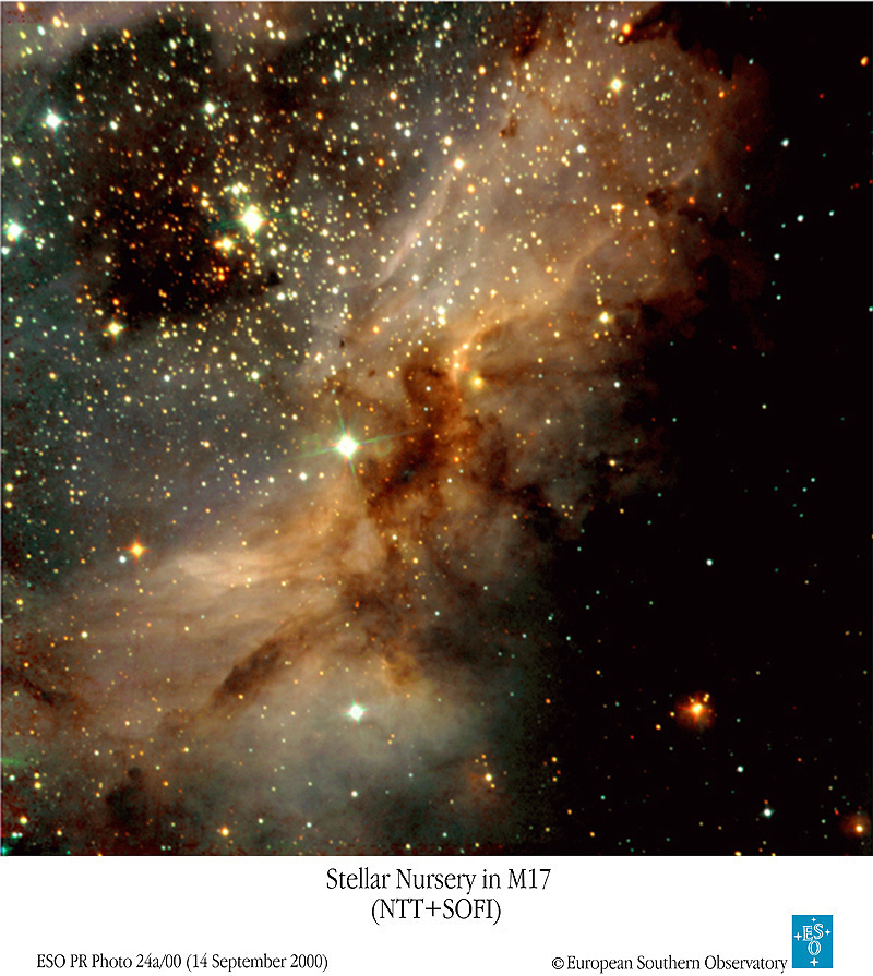 En las profundidades de las oscuras nubes de polvo y gas molecular conocidas como M17, las estrellas continúan formándose. En la fotografía de colores representativos de M17 recientemente publicada por el New Technology Telescope, son visibles nubes tan oscuras que parecen casi vacías de luz infrarroja cercana. La oscuridad de estas nubes moleculares se debe a que la luz estelar de fondo es absorbida por polvo denso del tamaño de partículas de humo a base de carbono. A medida que se forman estrellas masivas y brillantes, estas producen una luz intensa y energética que evapora lentamente el oscuro manto. El inusual aspecto de M17 le ha valido apodos como la Nebulosa Omega, la Nebulosa de la Herradura y la Nebulosa del Cisne. M17, visible con binoculares en dirección a la constelación de Sagitario, se encuentra a 5.000 años-luz de distancia y abarca 20 años-luz de extensión.