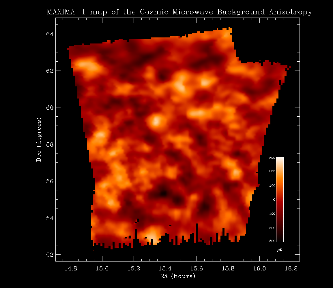Sin importar en qué dirección se mire, ni qué tipo de luz se observe, el cielo brilla, ¿pero por qué? Las fuentes de muchas de estas radiaciones de fondo han constituido enigmas de larga data, pero este año del milenio aportó algunas resoluciones parciales. En luz de rayos X, las naves espaciales Chandra y XMM, recientemente lanzadas, resolvieron gran parte del fondo de rayos X aparentemente uniforme en numerosas fuentes discretas, muchas de las cuales parecen ser agujeros negros en los centros de galaxias que acumulan materia. En luz de microondas, las misiones BOOMERANG y MAXIMA-1 resolvieron con nueva claridad el aparentemente uniforme fondo de microondas. El tamaño y la distribución de estas manchas indican un universo geométricamente plano que, combinado con recientes resultados de supernovas, apunta a un universo con una tasa de expansión acelerada lleno de materia oscura y energía oscura. En la imagen, un mapa que abarca diez grados del cielo en microondas resuelve el fondo de microondas en manchas calientes y frías, indicadas en microkelvins.