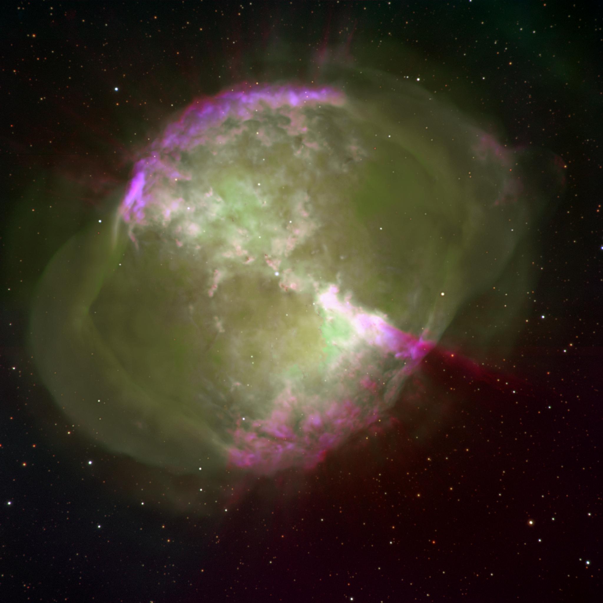La primera pista de lo que será del Sol ocurrió de forma accidental en 1764. En ese momento, Charles Messier estaba compilando una lista de objetos difusos "molestones" que no debían confundirse con cometas "interesantes". El 27º objeto en la lista de Messier, ahora conocido como M27 o la Nebulosa del Doble Culo, es una nebulosa planetaria, el tipo de nebulosa que el Sol producirá cuando deje de fusionarse en su núcleo. M27 es una de las nebulosas planetarias más brillantes en el cielo, y se puede ver en la constelación de Vulpecula con binoculares. A la luz le toma aproximadamente 1000 años llegar a nosotros desde M27, mostrada arriba en colores representativos. Comprender la física y la importancia de M27 estaba claramente más allá de la ciencia del siglo XVIII. Incluso hoy en día, muchas cosas siguen siendo misteriosas sobre nebulosas planetarias bipolares como M27, incluyendo el mecanismo físico que expulsa la envoltura gaseosa externa de una estrella de baja masa, dejando un enano blanco caliente en rayos X.