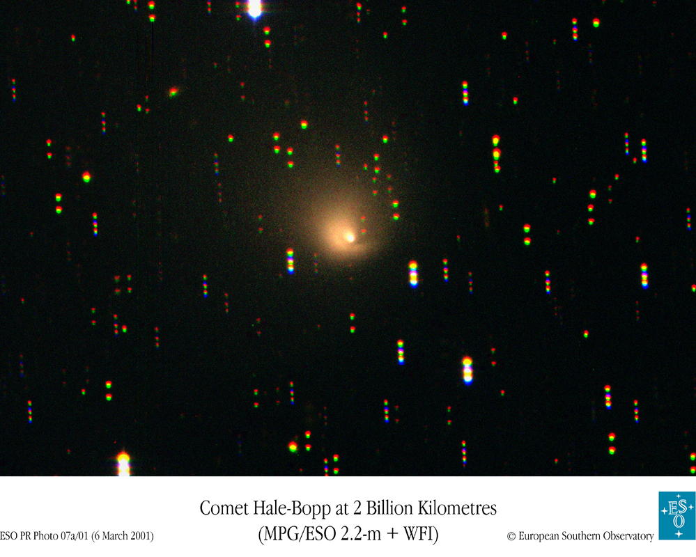 Whatever became of Comet Hale-Bopp? The brightest comet in recent years has continued into the outer Solar System and is now farther from the Sun than Saturn. To the surprise of many, Comet Hale-Bopp is still active, continuing to spew gas, ice and dust particles out into space. Pictured above earlier this month, Comet Hale-Bopp can be seen in the Southern Hemisphere with a moderate sized-telescope. The continued activity of Comet Hale-Bopp may be due to the large size of its nucleus - estimated to be about 50 kilometers across. The unusual dotted appearance of most stars in the above image is due to the 14 discrete exposures that were centered on the comet and not the stars.