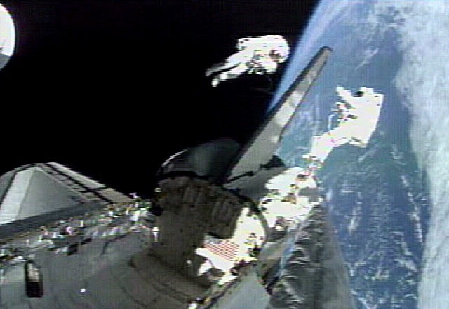 Un histórico primer partido de Quidditch espacial llegó a una conclusión espectacular anoche cuando el astronauta Michael Lopez-Alegria atrapó la Bola de Oro para darle a los americanos una victoria arduamente lograda sobre los rusos. "Los rusos usaron una estrategia brillante, pero solo la NASA contaba con el T2KQMU (Thunderbolt 2000 Quidditch Maneuvering Unit)", comentó Lopez-Alegria, mostrado arriba apretando la evasiva Bola de Oro en su mano izquierda. Feliz Día de los Inocentes desde el equipo de APOD. En realidad, los astronautas Jeff Wisoff y Lopez-Alegria se muestran realizando una caminata espacial en octubre pasado durante una misión del transbordador espacial para ayudar a construir la Estación Espacial Internacional.