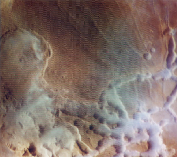 One place where water can be found on Mars is in clouds. In the above picture colorful water clouds are visible just after sunrise in and around a maze of canyons known as Noctis Labyrinthus (the labyrinth of the night). Scientists don't yet know, however, why these clouds formed, and why some stick to the canyons. One exciting possibility is that water sometimes condenses in shaded regions of the canyons, only to evaporate into clouds when exposed to the morning Sun. Water in any form on the Martian surface might be important to sustaining life and possible future human exploration. Viking Orbiter 1, which visited Mars in 1976, took the above picture. The region shown is about 100 kilometers across.