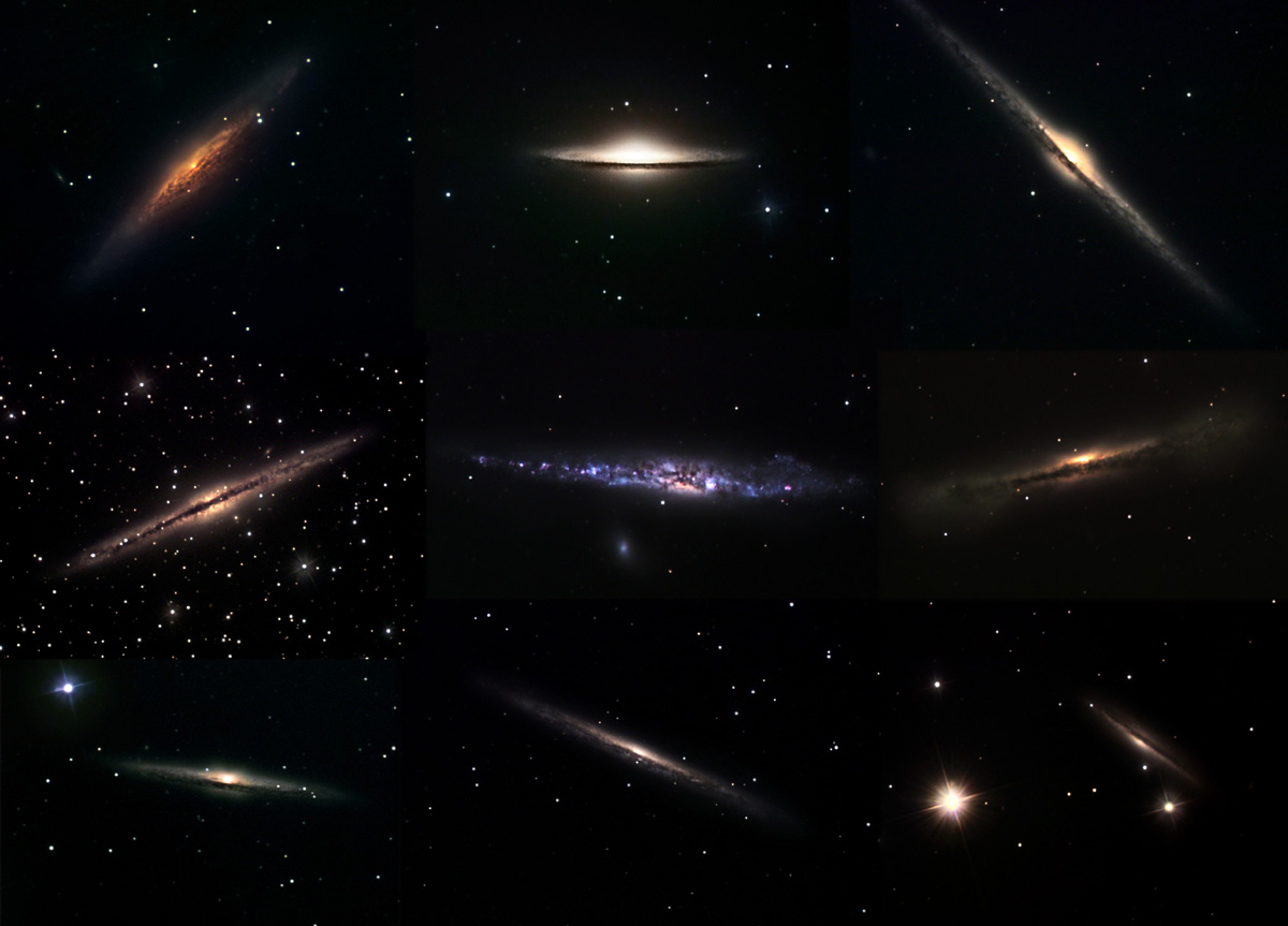 Las galaxias espirales vistas de cara muestran un diseño grandioso, con brazos espirales gráciles trazados por brillantes cúmulos estelares y nidos estelares que emiten luz. Cuando se ven de perfil, su apariencia es muy diferente pero no menos impactante, ya que sus regiones centrales se abultan y las vías oscuras de polvo cósmico aparecen en silueta contra la luz estelar proveniente de discos galácticos aplanados. Esta maestra mosaico de imágenes digitales muestra nueve galaxias espirales prominentes vistas de perfil, dispuestas de la siguiente manera: en la parte superior; NGC2683, M104, NGC4565, en el medio; NGC891, NGC4631, NGC3628, y en la parte inferior; NGC5746, NGC5907 y NGC4217. Quizás la más conocida de estas es M104 (NGC4594), cuyo nombre más descriptivo es la Galaxia Sombrero. Notablemente, la perspectiva de perfil de estas galaxias permite medir su velocidad de rotación galáctica utilizando el efecto Doppler. Graficar la velocidad de rotación en función de la distancia desde el centro determina la masa gravitacional de una galaxia y, históricamente, condujo a la evidencia más destacada sobre la materia oscura misteriosa.