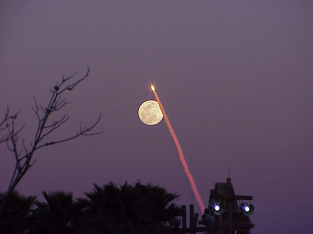 As a gorgeous full Moon rose above the eastern horizon on February 7, the Space Shuttle Atlantis streaked skyward towards an orbital rendezvous with the International Space Station. Watching from Orlando, Florida, about 60 miles west of the Kennedy Space Center launch site, photographer Tony DeVito captured this digital image, one of a series of pictures of the shuttle's fiery climb. While foreground street lights flickered on and a clear evening sky grew dark, the shuttle's path just grazed the bright lunar disk. On this mission, STS-98, Atlantis carried the U.S. Destiny laboratory module to be added to the expanding orbital outpost. Atlantis is currently scheduled to return to the space station next month.