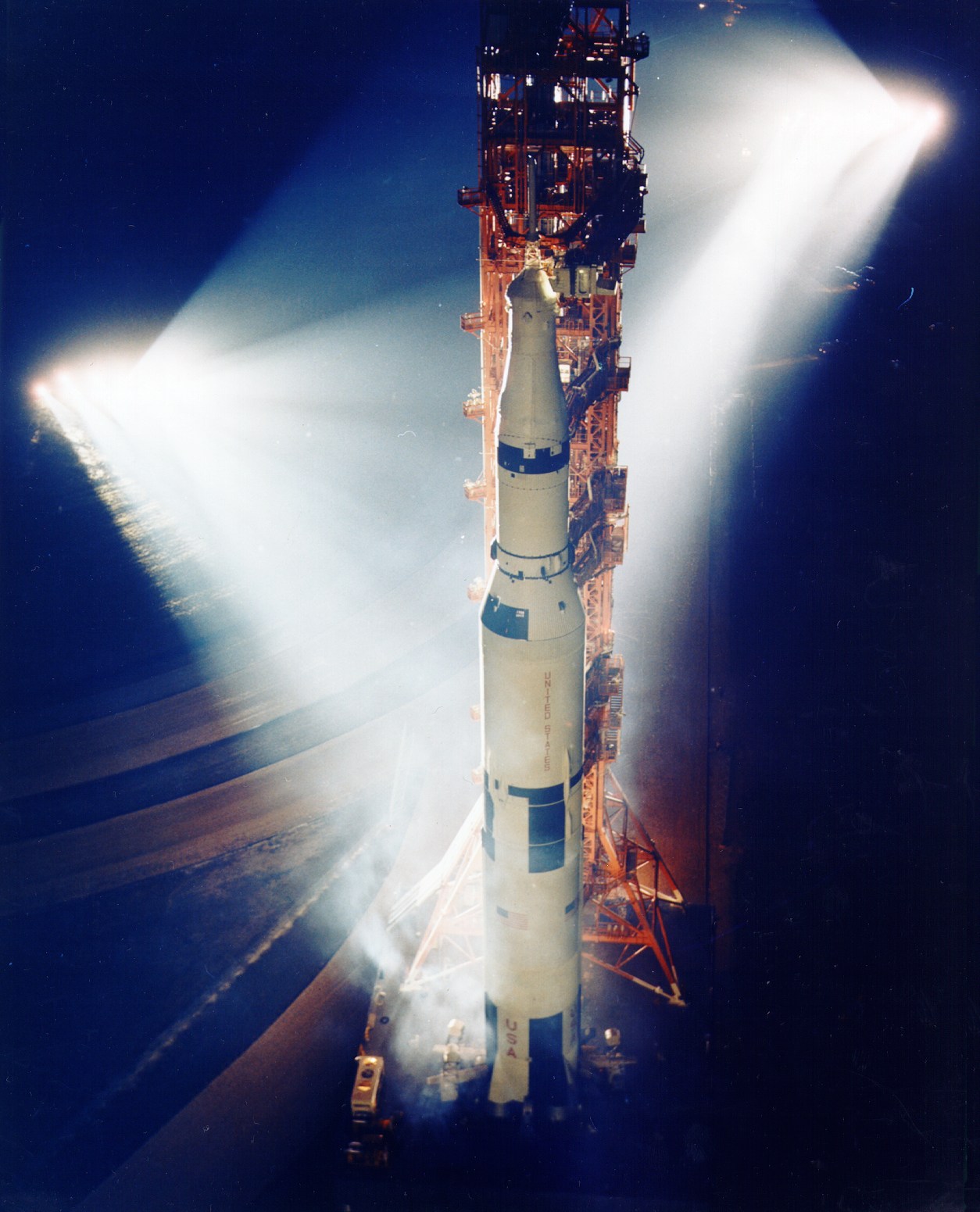 Forty years ago today (May 25, 1961) U.S. president John Kennedy announced the goal of landing Americans on the Moon by the end of the decade. Kennedy's ambitious speech triggered a nearly unprecedented peacetime technological mobilization and one result was the Saturn V moon rocket. Its development directed by rocket pioneer Wernher Von Braun, the three stage Saturn V stood over 36 stories tall. It had a cluster of five first stage engines fueled by liquid oxygen and kerosene which together were capable of producing 7.5 million pounds of thrust. Giant Saturn V rockets ultimately hurled nine Apollo missions to the Moon and back again with six landing on the lunar surface. The first landing, by Apollo 11, occurred on July 20, 1969 achieving Kennedy's goal. Bathed in light, this Saturn V awaits an April 11, 1970 launch on the third lunar landing mission, Apollo 13.