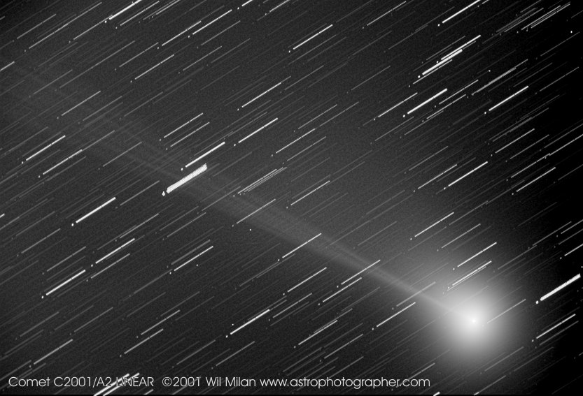 El cometa C/2001 A2 (LINEAR) ha cruzado el ecuador celeste y se dirige hacia el norte. En su trayectoria hacia afuera, esta pieza primitiva del sistema solar aún es visible a simple vista y ahora puede ser observado por los amantes del cielo en el hemisferio norte a medida que atraviesa la constelación de Piscis. Esta imagen del cometa es una combinación de 33 exposiciones individuales de un minuto cada una, tomadas el 30 de junio con un telescopio pequeño y una cámara digital ubicados en Arizona central, EE. UU. La imagen compuesta resalta detalles tenues en la cola del cometa, que se reportó que se extendía por varios grados, más allá del campo de visión aproximado de 2 grados de la cámara. Las exposiciones, estrechamente espaciadas, fueron registradas en el cometa, por lo que las estrellas de fondo aparecen como trazos. Para producir la "puntuación" al final de cada trazo estelar, se omitieron dos exposiciones cercanas al final de la secuencia. Como resultado, los puntos finales revelan claramente el patrón del campo estelar de fondo.
