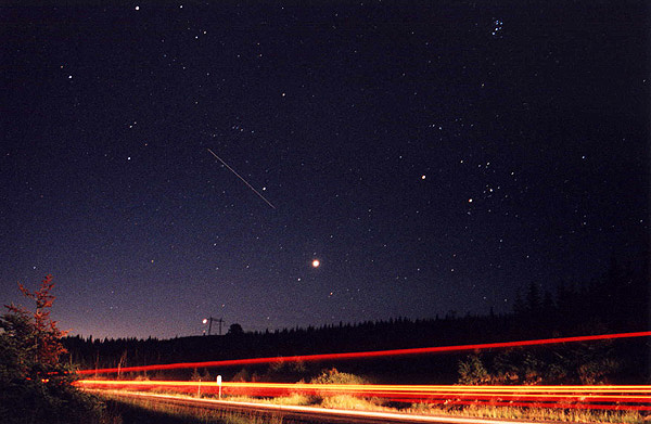 Those up before dawn in late July in the northern hemisphere could see planets, stars, and a spacecraft in a single quick glance before starting their day. Near the eastern horizon was bright Jupiter, and not far above and to its right was the very bright Venus. Connecting the dots will point you just right of Saturn. Far in the distance but near the top right of the frame is the Pleiades star cluster. Orbiting the Earth well in the foreground, the International Space Station reflected sunlight to cause the faint line segment. In the very close foreground, the bright red and yellow lines were caused by a passing van. The above picture was taken on July 26 from Quebec, Canada. Why are bushes visible through the van? The van was present for only a few of the 25 seconds of the total exposure.