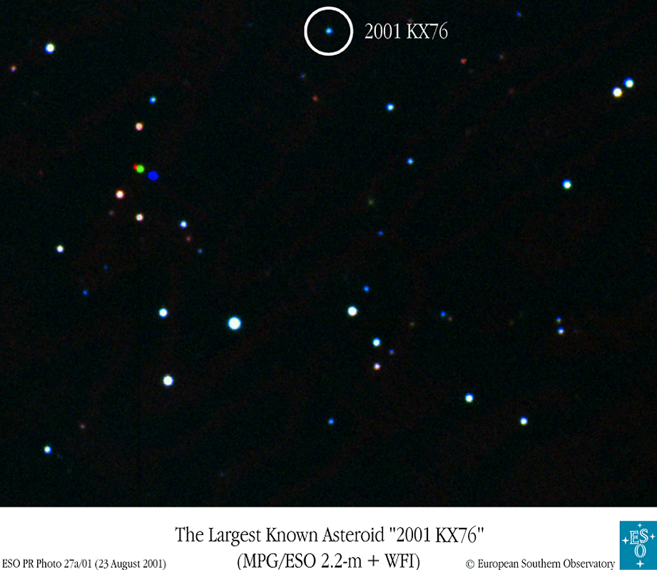 Newly discovered minor planet 2001 KX76 is circled in the top panel above, a recent composite image from the European Southern Observatory's 2.2 meter telescope at La Silla, Chile. Though 2001 KX76 appears here as single point of light in an unremarkable star field, its orbit has been accurately measured by Astrovirtel, a newly operational "virtual telescope" capable of mining many years of archival data for previously unrecognized images of 2001 KX76. The results show this minor planet to be very distant, now orbiting just beyond Pluto and Charon in the realm of the Kuiper Belt. At its distance, apparent brightness, and assuming a reasonable surface reflectivity, 2001 KX76 would be 1,200 kilometers or more across -- larger than the largest main-belt asteroid, Ceres. In fact, the illustration in the bottom panel graphically compares this size estimate to Pluto, Charon, and the largest previously known Kuiper Belt objects, indicating the newfound minor planet is second only to Pluto in diameter. Along with other evidence, the comparison suggests that Pluto and Charon are closely related to Kuiper Belt worlds like 2001 KX76.