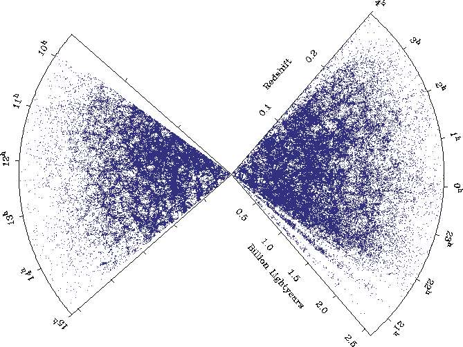 How are galaxies distributed in the universe? This question is of more than aesthetic interest because the answer likely holds clues to composition of the universe itself. The above map shows the distribution of nearly 200,000 galaxies and is the latest answer obtained by one of the most complex astronomical instruments yet created: the Two-Degree Field (2dF) system. The 2dF system measures galaxy redshifts, allowing astronomers to estimate distances to some of the millions of galaxies visible, and hence to make a three-dimensional map of the local universe. Although the distribution of galaxies appears nearly uniform on the largest scale, waves of galaxies are discernable extending up to 100 million light-years. Detailed analyses of the incoming data indicate that to create such a network of waves, normal baryonic matter must make up only 15 percent of all matter, while all matter must make up only about 30 percent of that needed to make the universe geometrically flat. Is the remaining 70 percent dark energy?