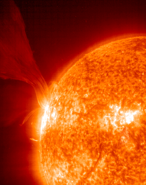 Nuestro Sol sigue siendo muy activo. El año pasado, nuestro Sol atravesó el Máximo Solar, el momento en su ciclo de 11 años donde ocurren la mayor cantidad de manchas solares y actividades explosivas. Las manchas solares, el Ciclo Solar y las prominencias solares son todos causados por el campo magnético cambiante del Sol. En la imagen de arriba se muestra una prominencia solar que estalló el 15 de mayo, lanzando electrones e iones hacia el Sistema Solar. La imagen fue tomada en la luz ultravioleta emitida por un tipo específico de helio ionizado, un elemento común en el Sol. Las áreas particularmente calientes aparecen en blanco, mientras que las áreas relativamente frías aparecen en rojo. Nuestro Sol debería calmarse gradualmente hasta que ocurra el Mínimo Solar en 2007.