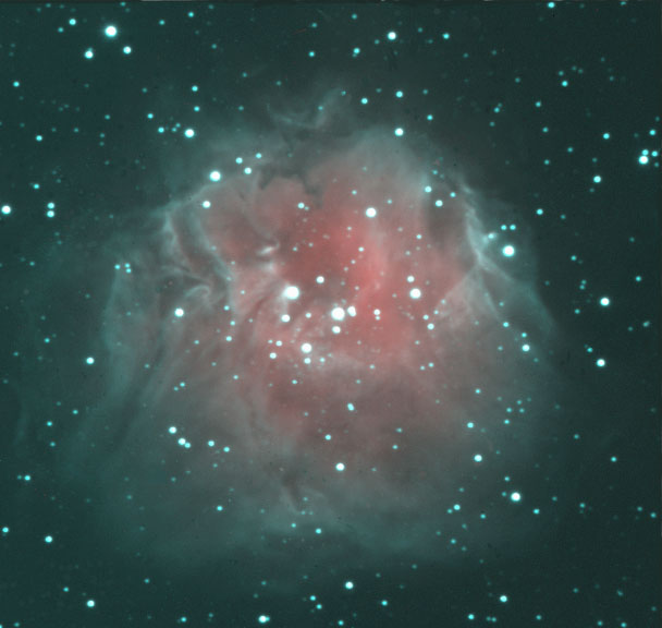 ¿Dónde se forman las estrellas más masivas? La evidencia observacional indica que los bordes de los recientes cúmulos abiertos de estrellas son lugares principales. En la imagen se muestra uno de tales cúmulos abiertos: Sharpless 212. En el centro de la imagen se ven estrellas masivas dentro del cúmulo. La luz energética de estas estrellas ioniza los átomos de hidrógeno circundantes, creando una región HII. A medida que los átomos de hidrógeno recuperan electrones, emiten la luz roja resaltada. Sharpless 212 también contiene pequeñas cantidades de polvo y átomos pesados como el azufre. El polvo absorbe eficientemente la luz, mientras que la emisión del azufre se resalta en azul. Particularmente llamativas y bien definidas son las fronteras que separan el material ionizado del material neutro circundante, visibles en el borde de la región HII. Sharpless 212 abarca aproximadamente 20 años luz y se encuentra a unos 25 000 años luz de distancia.