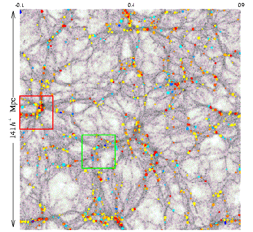 Where is dark matter? Galaxies rotate and move in clusters as if a tremendous amount of unseen matter is present. But does dark matter exist in the greater universe too -- and if so, where? The answer can be found by comparing the distribution of galaxies observed with numerical simulations. This comparison became much more accurate recently when over 100,000 galaxy observations from the 2-Degree Field Galactic Redshift Survey were used. In the above frame from a computer simulation of our universe, a 300 million light-year slice shows dark matter in gray and galaxies as colored circles. The red box indicates the location of a rich cluster of galaxies, while the green box shows a more typical cross-section of our universe. Analyses indicate that the immense gravity of the pervasive dark matter pulls normal matter to it, so that light matter and dark matter actually cluster together.