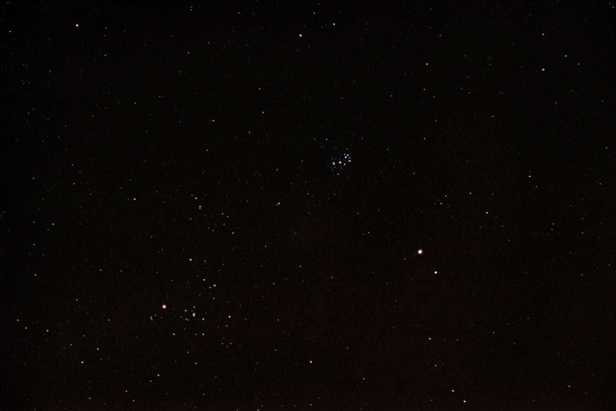 Viewed from Earth, the solar system's planets do a cosmic dance that is hard to appreciate on any single night. But consider this well planned animated sequence combining 23 pictures taken at approximately 2 week intervals from June 2000 through May 2001. It reveals the graceful looping or retrograde motion of bright wanderers Jupiter (leftmost) and Saturn. Loitering among the background stars are the familiar Pleiades (above right) and V-shaped Hyades (below left) star clusters. The planets didn't actually loop by reversing the direction of their orbits, though. Their apparent retrograde motion is a reflection of the motion of the Earth itself. Retrograde motion can be seen each time Earth overtakes and laps planets orbiting farther from the Sun, Earth moving more rapidly through its own relatively close-in orbit. Astronomer Tunc Tezel captured Jupiter and Saturn's "paired" retrograde loop in this remarkable series made after the close alignment of these gas giants in May 2000. The next opportunity to see these two planets dance such a pas de deux will be in the year 2020.