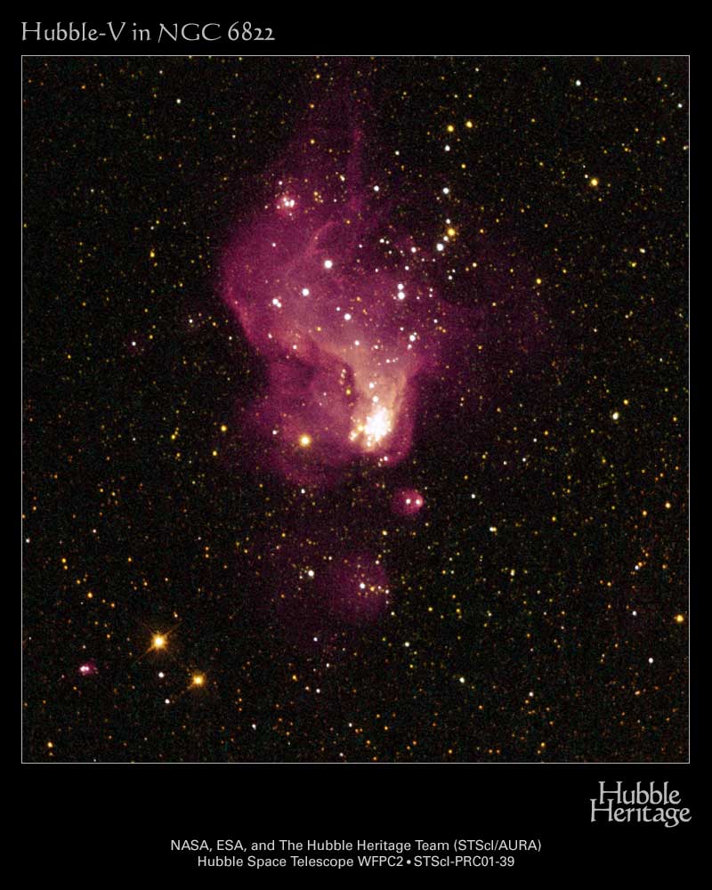 ¿Cómo se formaron las estrellas en el universo primitivo? Los astrónomos están obteniendo información al estudiar NGC 6822, una galaxia cercana clasificada como irregular por los estándares modernos, pero que parece más típica de las galaxias que existían hace miles de millones de años. La inspección de NGC 6822 revela varios grupos brillantes de estrellas, incluyendo dos llamados Hubble-X y Hubble-V. En la imagen mostrada, el Telescopio Espacial Hubble ha resuelto Hubble V en las estrellas energéticas que están iluminando el gas circundante. Cada estrella en el nudo denso central de Hubble V brilla más intensamente que 100 000 soles. La nube de gas de Hubble V tiene un tamaño de aproximadamente 200 años luz y se encuentra a unos 1,5 millones de años luz de distancia, en dirección a la constelación de Sagitario.