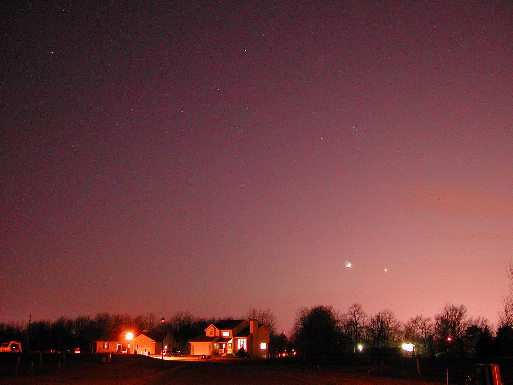 Have you seen any bright planets lately? Chances are if you've been outside under clear skies just after sunset, then you have. Now shining in the west as bright "stars" in the night sky, are all five planets of the solar system known to ancient astronomers - Mercury, Venus, Mars, Saturn, and Jupiter. Recorded from Holt, Michigan, USA about 40 minutes after sunset on April 14th, this digital image captures three of them, Venus, Mars, and Saturn, along with a young crescent Moon. Also indicated are the Pleiades star cluster and bright red giant star Aldebaran in Taurus. Mercury, setting, is lost in the trees and glow along the horizon, while Jupiter is off the top of this view. The coming weeks will see photo opportunities galore as all five planets gradually move closer together, posing after sunset with the Moon and stars in the western sky. Venus, Mars, and Saturn will form the closest trio, drawing within a 5 degree circle (about the apparent size of your fist with arm extended) above Aldebaran by May 3rd.