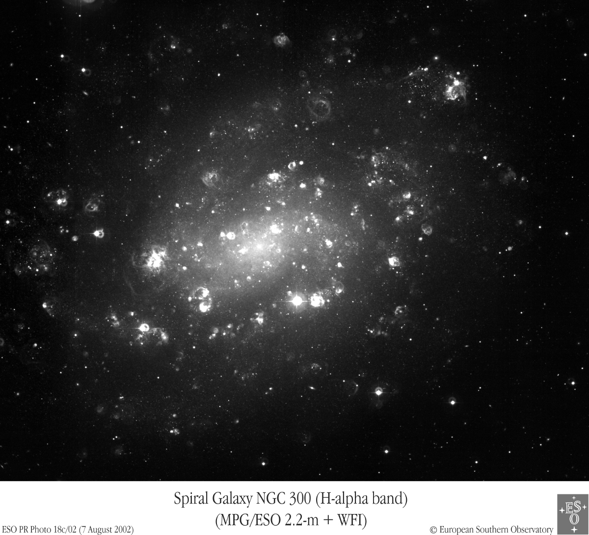 Featured in color in yesterday's episode, big, beautiful, face-on spiral galaxy NGC 300 is seen here through a narrow filter that transmits only the red light of hydrogen atoms. Ionized by energetic starlight, a hydrogen atom emits the characteristic red H-alpha light as its single electron is recaptured and transitions to lower energy states. As a result, this image of NGC 300 is dominated by regions filled with massive, young stars and shell-shaped clouds of hydrogen gas hundreds to thousands of light-years across. Formed in groups called OB associations, the stars are likely only a few million years young. The hydrogen clouds are glowing nebulae or HII regions that have been sculpted by the strong stellar winds and ultraviolet radiation. While picking out your favorite cosmic shell in this picture, don't be misled by the relatively bright foreground stars located in our own Milky Way galaxy. They often show spikes and rings caused by the telescope and camera system.