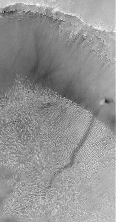 ¿Cambia la superficie de Marte? Al inspeccionar imágenes anuales de la superficie marciana tomadas por la sonda robótica Mars Global Surveyor que actualmente orbita Marte, a veces son visibles nuevos rastros oscuros. Aunque originalmente fue un misterio, el responsable ahora es generalmente conocido por ser un remolino de polvo, una enorme nube de gas rotatorio con similitudes a un tornado terrestre. En la imagen superior, una fotografía reciente no solo ha capturado un nuevo rastro oscuro sino el remolino de polvo mismo escalando la pared de un cráter. Los remolinos de polvo se crean cuando el aire marciano es calentado por una superficie cálida y comienza a girar mientras sube. Los remolinos de polvo pueden extenderse 8 kilómetros de altura pero generalmente duran solo algunos minutos.