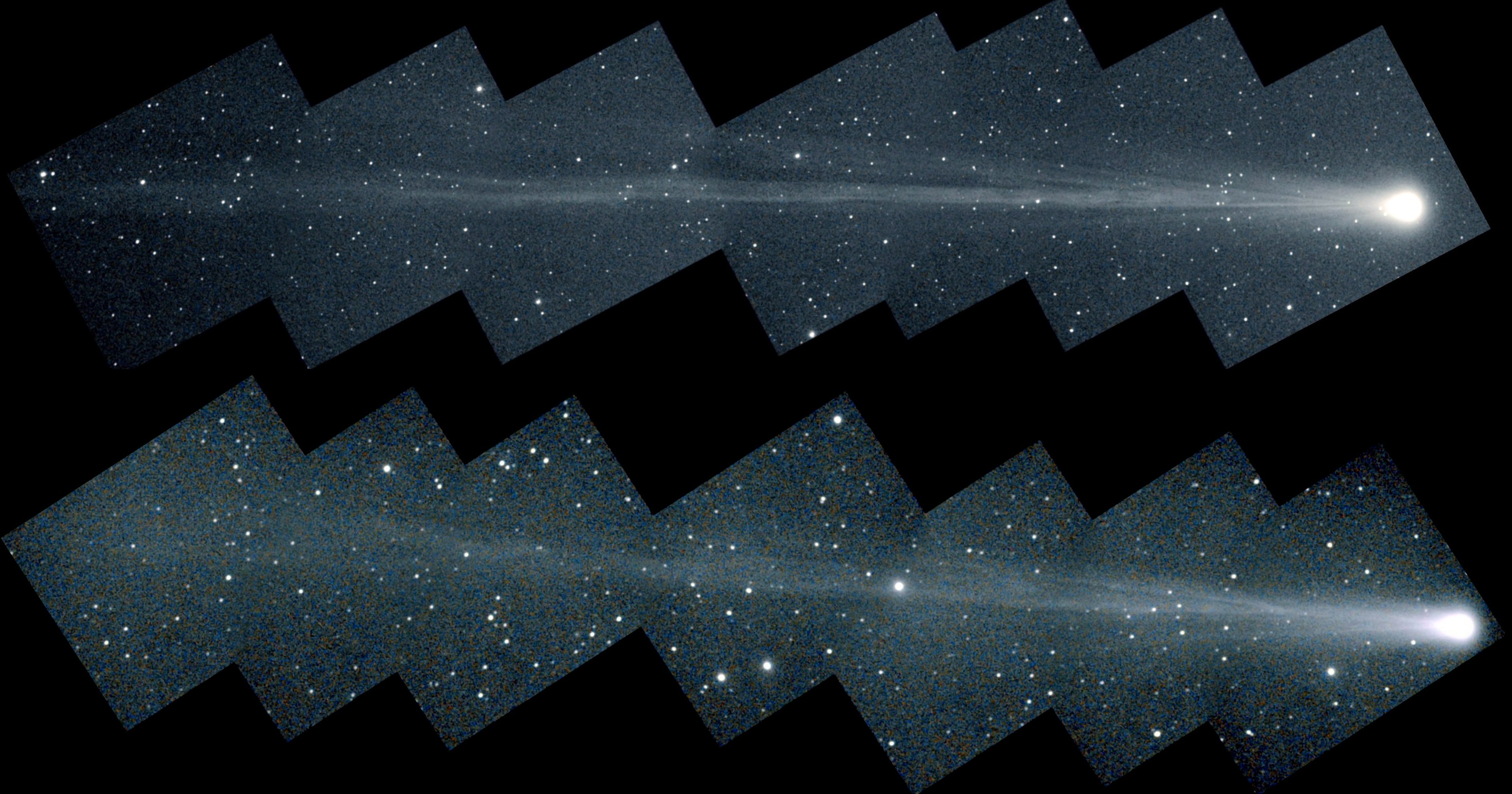 Es probable que un cometa pueda volverse visible a simple vista durante los próximos días sobre el horizonte donde el Sol acaba de ponerse. El cometa NEAT (C/2002 V1), descubierto el pasado noviembre, se ha iluminado dramáticamente conforme se acerca al Sol. Durante los próximos días, el cometa que se oculta rápidamente podría alcanzar una magnitud de segunda magnitud. El 18 de febrero redondeará el Sol bien dentro de la órbita de Mercurio. Durante los días circundantes, el brillo del Sol ocultará efectivamente el cometa a los observadores humanos. Es bastante probable, sin embargo, que el cometa NEAT destaque prominentemente en las imágenes capturadas por el satélite SOHO que observa al Sol. En la imagen superior, la cola compleja y en desarrollo del cometa NEAT fue fotografiada el 29 de enero (arriba) y el 2 de febrero. Los entusiastas del cielo deben recordar nunca mirar directamente al Sol.