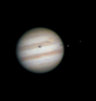 It's no wonder Jupiter is a favorite target for even modest earthbound telescopes. The most massive planet in the solar system with four of the largest moons also boasts the famous Great Red Spot, a giant hurricane-like storm system over three hundred years old. Recorded on December 15, 2002 between 7:19 and 8:40 UT, over a thousand digital images were processed and stacked to create this spectacular 21 frame animation of the Jovian system. South is up and as the Great Red Spot tracks across the face of Jupiter, innermost Galilean moon Io enters the scene at the far right. Io occults (passes in front of) the edge of the more sedately orbiting Ganymede with Io's shadow moving quickly across the gas giant's cloud tops, just below the Red Spot. While the moon Callisto is outside the field of view, its large, dark shadow is also visible crossing the Jovian disk at the upper left. Viewed from Earth, the orbits of the Galilean moons presently lie nearly edge-on, offering many chances to observe similar dances of Jupiter's moons.