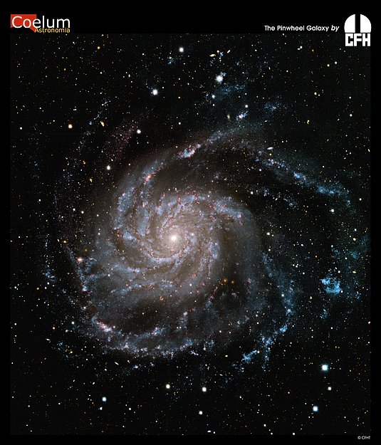 ¿Por qué muchas galaxias presentan una estructura espiral? Un ejemplo llamativo es M101, mostrada arriba, cuya distancia relativamente cercana de aproximadamente 22 millones de años luz permite estudiarla con cierto detalle. Evidencia reciente indica que una interacción gravitatoria cercana con una galaxia vecina creó ondas de masa elevada y gas condensado que continúan orbitando alrededor del centro galáctico. Estas ondas comprimen el gas existente y provocan la formación de estrellas. Como resultado, M101, también llamada la Galaxia del Molinete, posee varias regiones de formación estelar extremadamente brillantes (llamadas regiones HII) distribuidas a lo largo de sus brazos espirales. M101 es tan grande que su gravedad inmensa distorsiona las galaxias más pequeñas cercanas.