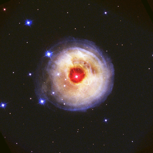 What caused this outburst of V838 Mon? For reasons unknown, star V838 Mon's outer surface suddenly greatly expanded with the result that it became the brightest star in the entire Milky Way Galaxy. Then, just as suddenly, it faded. A stellar flash like this has never been seen before -- supernovas and novas expel matter out into space. Although the V838 Mon flash appears to expel material into space, what is seen in the above four-frame movie is actually an outwardly moving light echo of the bright flash. The actual time-span of the movie is 8 months during 2002. In a light echo, light from the flash is reflected by successively more distant rings in the complex array of ambient interstellar dust that already surrounded the star. V838 Mon lies about 20,000 light years away toward the constellation of Monoceros, while the largest light echo above spans about six light years in diameter.