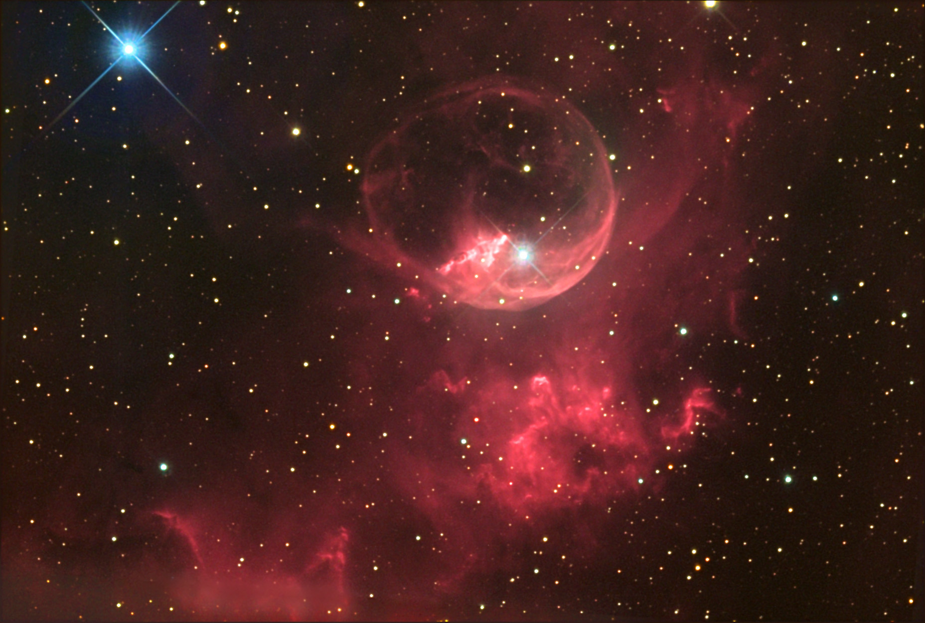 Es la burbuja versus la nube. NGC 7635, la Nebulosa de la Burbuja, está siendo empujada hacia afuera por el viento estelar de la masiva estrella central BD+602522. Pero justo al lado, vive una gigantesca nube molecular, visible arriba hacia la esquina inferior derecha. En este lugar del espacio, una fuerza irresistible se encuentra con un objeto inmovible de una manera interesante. La nube es capaz de contener la expansión del gas de la burbuja, pero es bombardeada por la radiación caliente de la estrella central de la burbuja. La radiación calienta regiones densas de la nube molecular, haciendo que brille. La Nebulosa de la Burbuja, fotografiada arriba como un negativo de color para ayudar a resaltar el contraste, tiene aproximadamente 10 años luz de diámetro y es parte de un complejo mucho más grande de estrellas y capas. La Nebulosa de la Burbuja puede observarse con un pequeño telescopio hacia la constelación de Casiopea.
