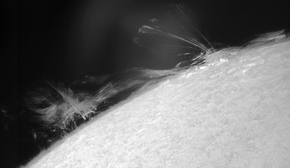 A veces se pueden observar protuberancias solares dramáticas asomándose justo más allá del borde del Sol. Una protuberancia solar es una nube de gas solar mantenida justo por encima de la superficie por el campo magnético del Sol. La Tierra cabría fácilmente debajo de la protuberancia de la izquierda. Una protuberancia quiescente típicamente dura aproximadamente un mes y puede erupcionar en una eyección de masa coronal (EMC) que expulsa gas caliente hacia el Sistema Solar. Aunque muy calientes, las protuberancias típicamente aparecen oscuras cuando se observan contra el Sol, ya que son ligeramente más frías que la superficie. La imagen anterior en falso color fue tomada el 1 de junio desde Stuttgart, Alemania con un telescopio y cámara amateur.