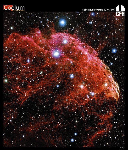 Hace aproximadamente 8000 años, una estrella en nuestra galaxia explotó. Los humanos antiguos podrían haber notado la supernova como una estrella temporal, pero los humanos modernos pueden ver la envoltura de gas en expansión incluso hoy en día. En la imagen anterior, parte de la envoltura de IC 443 se observa que está compuesta por filamentos complejos, algunos de los cuales impactan una nube molecular existente. Aquí, la emisión del hidrógeno molecular excitado por ondas de choque permite a los astrónomos estudiar cómo el gas de supernova de rápido movimiento afecta la formación de estrellas en la nube. Además, los astrónomos teoriza que el impacto acelera algunas partículas a velocidades cercanas a la velocidad de la luz. El remanente de supernova IC 443 también se sabe que brilla intensamente en luz infrarroja y de rayos X.