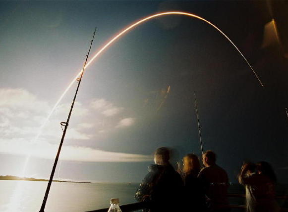 Streaking skyward, a Boeing Delta 2-Heavy rocket carries NASA's Space InfraRed Telescope Facility (SIRTF) aloft during the early morning hours of August 25th. The dramatic scene was recorded in a time exposure from the pier in Jetty Park at the northern end of Cocoa Beach, Florida, about 2.5 miles from the Cape Canaveral launch site. SIRTF (sounds like "sir tiff") will explore the distant Universe in infrared light as the fourth and final satellite observatory in NASA's Great Observatories Program. The three other large astrophysics satellites were designed for higher energies in the electromagnetic spectrum, with the Hubble Space Telescope operating near visible wavelengths, the Compton Gamma Ray Observatory instruments sensitive to gamma rays, and the Chandra Observatory detecting cosmic x-rays. SIRTF has been launched into an Earth-trailing solar orbit to reduce its exposure to infrared radiation from our fair planet. Cooled by an on board supply of liquid helium, SIRTF's infrared detectors will operate at near absolute zero temperatures. Presently, SIRTF's systems are undergoing a 90-day check out.