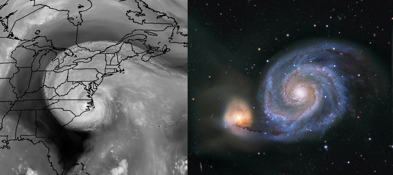 Uncomfortably close hurricane Isabel (left) and 30 million light-year distant galaxy M51 actually don't have much in common. For starters, Isabel was hundreds of miles across, while M51 (the Whirlpool Galaxy) spans about 50,000 light-years making them vastly dissimilar in scale, not to mention the extremely different physical interactions which control their formation and evolution. But they do look amazingly alike, both exhibiting the shape of a simple and beautiful mathematical curve known as a logarithmic spiral, a spiral whose separation grows in a geometric way with increasing distance from the center. Also known as the equiangular spiral, growth spiral, and Bernoulli's spiral or spira mirabilis, this curve's rich properties have fascinated mathematicians since its discovery by 17th century philosopher Descartes. Intriguingly, this abstract shape is much more abundant in nature than suggested by the striking visual comparison above. Logarithmic spirals also describe, for example, the arrangement of sunflower seeds, the shapes of nautilus shells, and ... cauliflower.