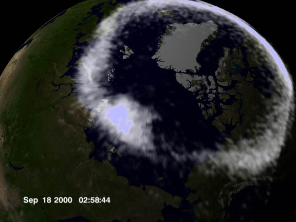 ¿De qué están hechas las auroras? Desencadenadas por la actividad solar, las auroras normales son causadas por colisiones entre electrones de rápido movimiento y el oxígeno y nitrógeno en la atmósfera superior de la Tierra. Los electrones provienen de la magnetosfera, la región del espacio controlada por el campo magnético terrestre. Cuando las moléculas de oxígeno y nitrógeno excitadas regresan a su estado de baja energía, emiten luz, visible como el brillo auroral. Sin embargo, a veces las auroras pueden ser causadas por colisiones con protones más pesados, causando un despliegue más energético con una fuerte emisión ultravioleta. Además, los protones pueden capturar temporalmente un electrón y emitir luz por sí solos. Tal aurora de protones se ve arriba, registrada por el satélite IMAGE. Una característica especial es el punto brillante cerca del centro de la imagen, incrustado en un anillo de emisión auroral alrededor del polo magnético norte del planeta Tierra. La mayoría de los protones del viento solar nunca alcanzan la Tierra para causar auroras porque son completamente desviados a una gran distancia por el campo magnético terrestre. El punto brillante en el anillo auroral indica una grieta particularmente profunda en el campo magnético terrestre donde los protones pudieron fluir a lo largo de una región temporalmente conectada entre el Sol y la Tierra, relativamente sin desviarse, hasta que impactaron la ionosfera de la Tierra.