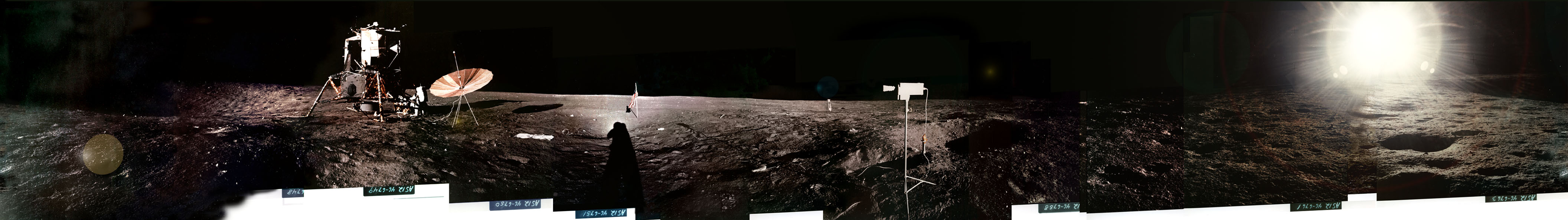 La misión Apolo 12 fue la segunda en llevar humanos a la Luna. La misión se dedicó al estudio de la Luna, al desarrollo de técnicas e instrumentos que podrían utilizarse en fututos alunizajes. Los astronautas Charles (Pete) Conrad y Alan Bean pasaron poco menos de dos días en la superficie lunar en noviembre de 1969, mientras que Richard Gordon orbitaba arriba en el Módulo de Comando. En el panorama cosido digitalmente que se muestra arriba, Alan Bean trabaja cerca del Módulo Lunar. Al desplazarse hacia la derecha se revela un panorama en tonos oscuros donde son visibles el terreno lunar plano y una cámara de video de gran altura. Los astronautas de la misión Apolo 12 visitaron el sitio de la cercana nave robótica Surveyor 3 que había alunizado tres años antes.