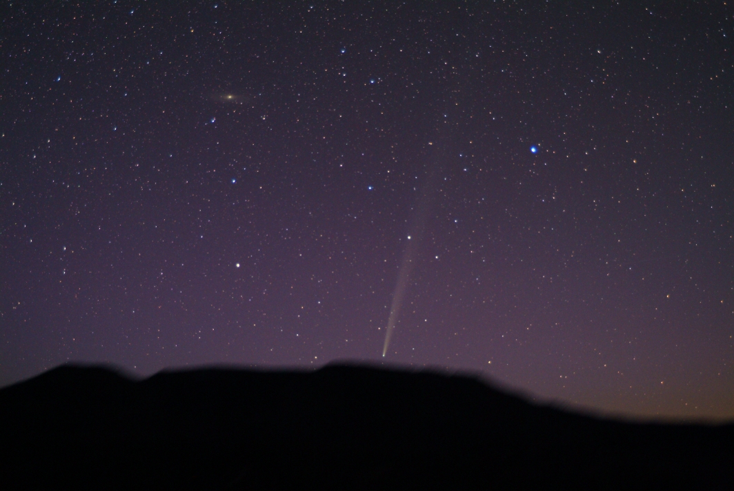 El cometa Bradfield se ha convertido en un espectáculo notable poco antes del amanecer, para quienes cuenten con binoculares o cámaras fotográficas. Aunque se desvanece notablemente cada día, una carta celeste, una ubicación en el hemisferio norte y algo de paciencia permitirán a los observadores del cielo curiosos localizar la bola de nieve cósmica y su espectacular cola. Se podría llamar a Bradfield un cometa "fotográfico", ya que su cola extendida es demasiado larga para la mayoría de los telescopios, pero es capturada perfectamente por cámaras normales capaces de exposiciones prolongadas y configuradas para rotar con el cielo. Fotografiado hace apenas un día, el cometa C/2004 F4 (Bradfield) fue capturado mientras ascendía en sucesivas exposiciones de tres minutos sobre las Montañas Rocosas cerca de Yampa, Colorado, EE.UU. Visible en la esquina superior izquierda como una mancha difusa brillante está la Galaxia de Andrómeda (M31), a gran distancia. El cometa Bradfield fue descubierto hace apenas un mes y fue brevemente visible a simple vista. Fue fotografiado de manera espectacular por la nave espacial SOHO cuando redondeaba el Sol hace una semana.