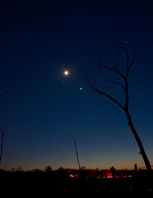 On April 23rd, the Moon along with planets Saturn, Mars, and Venus (and planet Earth of course ...) were all visible in the west at twilight, captured here from a site near Saylorvillle Lake north of Des Moines, Iowa, USA. Putting your cursor over the image will label our fellow solar system wanderers and also reveal the approximate trajectory of the ecliptic plane - defined by Earth's orbit around the Sun - angling above the western horizon. After sunset tonight, the western sky will present a similar arrangement of planets, although the Moon will have moved east out of the picture, passing bright Jupiter along the ecliptic and heading for May 4th's total lunar eclipse. May could also be a good month for comets.