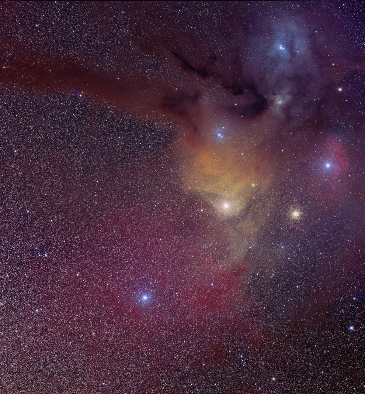 Connecting the Pipe Nebula to the bright star Antares is a flowing dark cloud nicknamed the Dark River. The murkiness of the Dark River is caused by absorption of background starlight by dust, although the nebula contains mostly hydrogen and molecular gas. Antares, the brightest star in the frame, is embedded in the colorful Rho Ophiuchi nebula clouds. The Dark River, pictured above across the upper left, spans over 20 times the angular diameter of the Moon and lies about 500 light years distant. Other types of nebula visible here include red emission nebula and the blue reflection nebula.