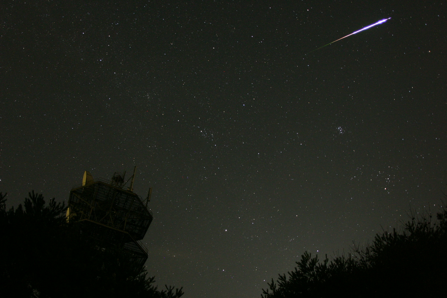 joying the bright Moon's absence from early morning skies, observers around the world reported lovely displays during this year's Perseid meteor shower. As anticipated, peak rates were about one meteor per minute. Though most Perseids were faint, this bright and colorful fireball meteor flashed through skies over Japan on August 12 at 0317 JST. Ending at the upper right, the meteor's trail points down and to the left, back to the shower's radiant point between the constellations of Perseus and Cassiopeia, seen here just above the tower structure in the foreground. The Pleiades star cluster is also visible well below the meteor's trail. Perseid shower meteors can be traced to particles of dust from the tail of comet Swift-Tuttle. The comet dust impacts the atmosphere at speeds of around 60 kilometers per second. While this annual shower's peak has come and gone, Perseid meteors should still be visible over the next few nights, but at a greatly reduced rate.