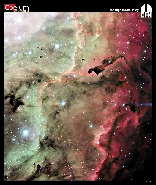 Stars are battling gas and dust in the Lagoon Nebula but the photographers are winning. Also known as M8, this photogenic nebula is visible even without binoculars towards the constellation of Sagittarius. The energetic processes of star formation create not only the colors but the chaos. The red-glowing gas results from high-energy starlight striking interstellar hydrogen gas. The dark dust filaments that lace M8 were created in the atmospheres of cool giant stars and in the debris from supernovae explosions. This spectacular portion of the Lagoon Nebula taken by the CFHT was created from light emitted by hydrogen (shown in red) and light emitted by oxygen (shown in green). The light from M8 we see today left about 5000 years ago. Light takes about 50 years to cross this section of M8.