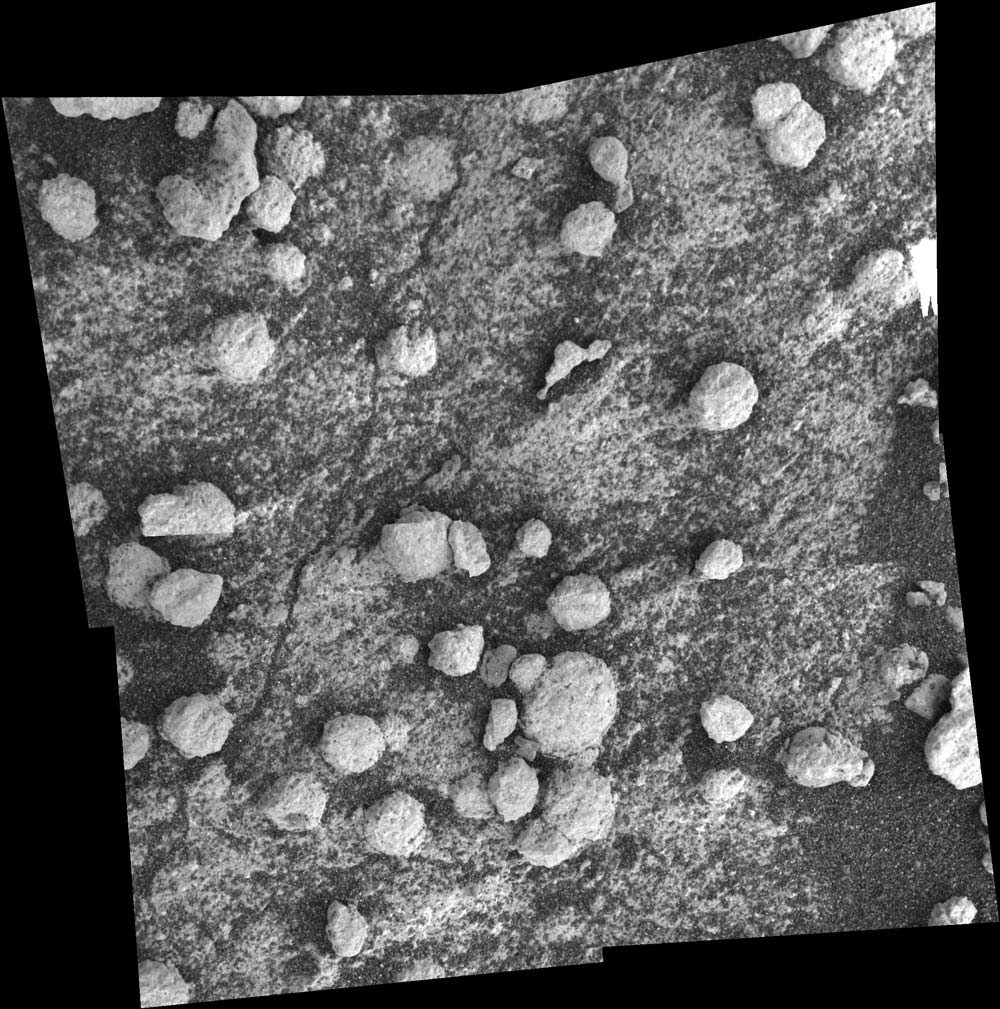 Why aren't these Martian rocks round? Small rocks dubbed blueberries have been found by the Opportunity rover all over Meridiani Planum on Mars, but the ones perched on Bylot rock have unusually non-spherical shapes. The strangely shaped blueberry rocks are shown above in an image taken by Opportunity's microscopic imager on August 9. Dark sand also covers much of Bylot rock. One hypothesis for the lack of blueberry roundness here is a coating relatively resistant to erosion. The average diameter of a blueberry is about 4 millimeters. The study of these and other rock features is allowing a better understanding of the wet past of ancient Mars.