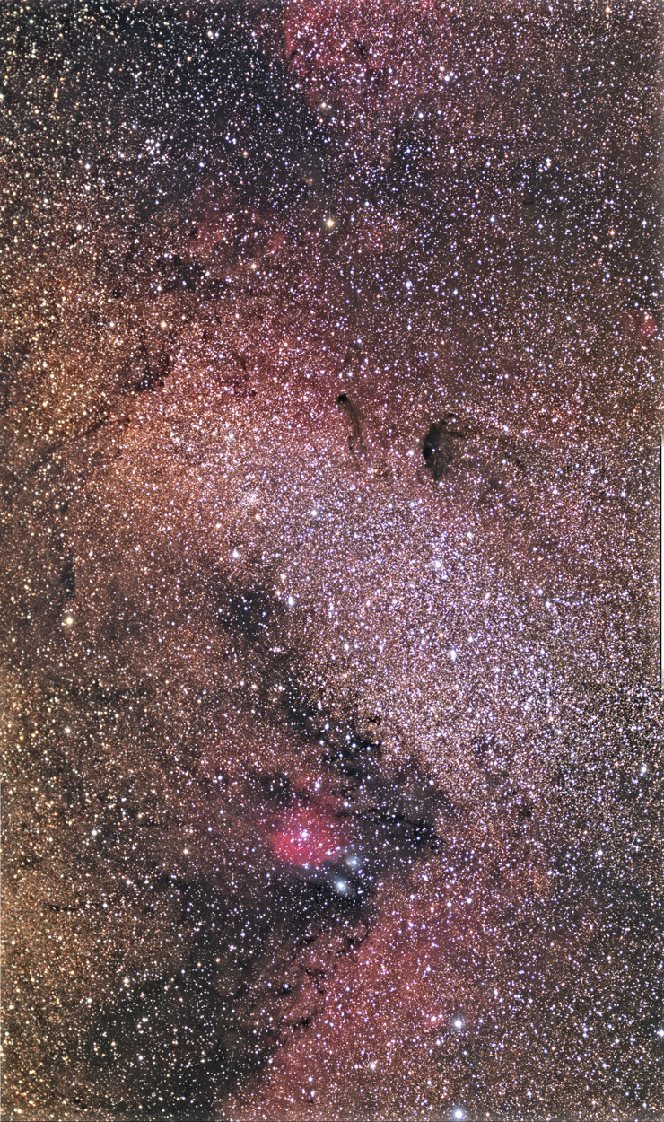 Muchos campos estelares extensos en el plano de nuestra Galaxia Vía Láctea son ricos en nubes de polvo y gas. En primer lugar, visibles en la imagen anterior hay millones de estrellas, muchas de las cuales son similares a nuestro Sol. A continuación, enormes filamentos de polvo interestelar oscuro atraviesan la imagen y bloquean la luz de millones de estrellas adicionales más allá en nuestra Galaxia. La región roja brillante a la izquierda es parte de la Nebulosa Omega, una nebulosa de emisión compuesta principalmente de gas hidrógeno caliente, también conocida como M17. Un pequeño grupo brillante de estrellas cerca del centro de la imagen es el cúmulo abierto M18, mientras que la larga franja brillante de estrellas justo a la derecha del centro es M24. En el extremo derecho de la imagen se encuentra la pintoresca nebulosa de emisión roja IC 1283, flanqueada por dos nebulosas de reflexión azules NGC 6589 y NGC 6590. Estos objetos son visibles con un pequeño telescopio hacia la constelación de Sagitario.