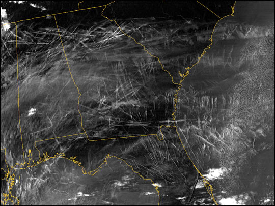 Artificial clouds made by humans may become so common they change the Earth's climate. The long thin cloud streaks that dominate the above satellite photograph of Georgia are contrails, cirrus clouds created by airplanes. The exhaust of an airplane engine can create a contrail by saturating the surrounding air with extra moisture. The wings of a plane can similarly create contrails by dropping the temperature and causing small ice-crystals to form. Contrails have become more than an oddity - they may be significantly increasing the cloudiness of Earth, reflecting sunlight back into space by day, and heat radiation back to Earth even at night. The effect on climate is a topic of much research. You can help NASA measure the actual abundance of contrails by participating in a contrail counting exercise that runs over the next two days.