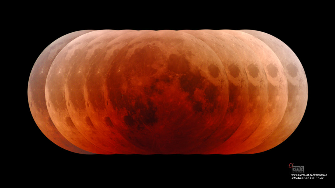 Does this look familiar? Red and orange hues haunting the face of the Moon should remind you of the October 27th total lunar eclipse. Created from exposures taken at intervals of 8.5 minutes during the total eclipse phase, the midpoint of the eclipse corresponds to the central exposure. The play of light across the lunar surface nicely demonstrates that the Earth's shadow is not uniformly dark as it extends into space. In fact, lunar maria and montes are still visible in the dimmed, reddened sunlight scattered into the cone-shaped shadow region, or umbra, by the atmosphere. Still, while processing the pictures into this composite image, astronomer Sebastien Gauthier was reminded of another haunting orange face. Have a safe and happy Halloween!