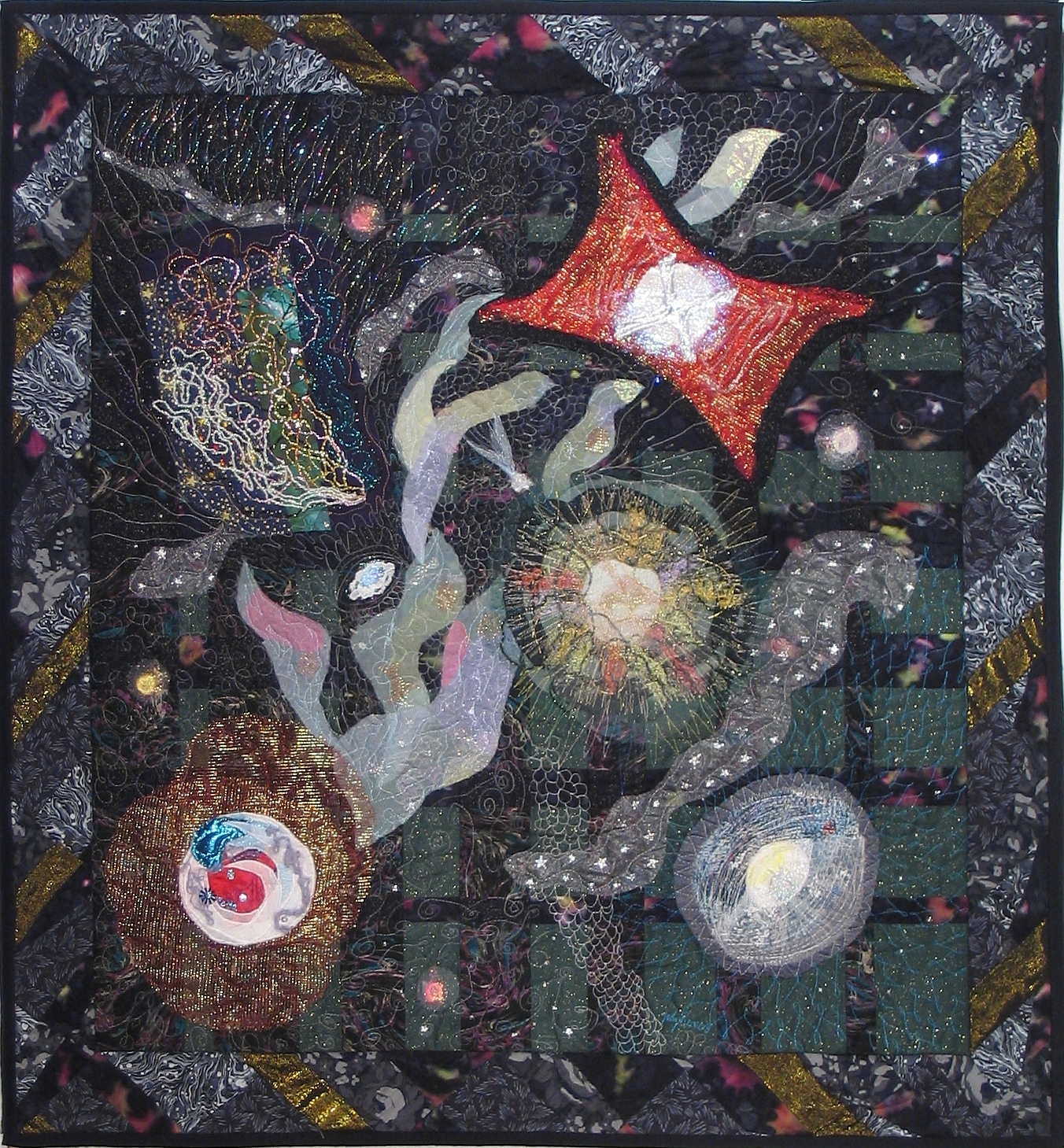 In this striking 41 inch by 38 inch quilt, astronomy enthusiast Judy Ross has interpreted some of the Hubble Space Telescope's best galactic and extragalactic vistas. Featured in past APODs, clockwise from the lower right are; the Red Rectangle Nebula, NGC 2392, the Sleeping Beauty Galaxy, V838 Monocerotis - the Milky Way's most mysterious star, and supernova remnant N49 - the cosmic debris from an exploded star. Of course, quilts have been used historically to represent astronomical concepts. And while inspired by the images of the cosmos that she incorporates into her quilts, Ross reports that she is still a little daunted by the intricacies of the Cat's Eye Nebula revealed by the Hubble's sharp vision.