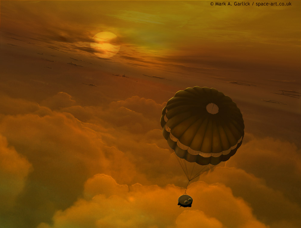 ¿Aterrizará o se sumergirá la sonda Huygens? En los próximos días, la nave espacial Cassini que orbita actualmente Saturno liberará una sonda que descenderá hacia la luna más grande de Saturno a mediados de enero. Esa luna, Titán, tiene una superficie normalmente oculta a la vista por espesos estratos de nubes de metano. Lo que encontrará la sonda de tamaño similar al de un automóvil, con forma de platillo volante, es desconocido. Una vez que alcance la superficie, Huygens podría sobrevivir hasta 150 minutos y capturar hasta 1.100 imágenes. Estas imágenes serán transmitidas hacia la nave nodriza Cassini que pasa, para su posterior transmisión a la Tierra en espera. La sonda Huygens se muestra arriba entrando en la atmósfera de Titán y desplegando su paracaídas. Descubrir la luna más misteriosa del Sistema Solar podría revelar una superficie tan extraña que las imágenes de la misma podrían no ser comprendidas inmediatamente.