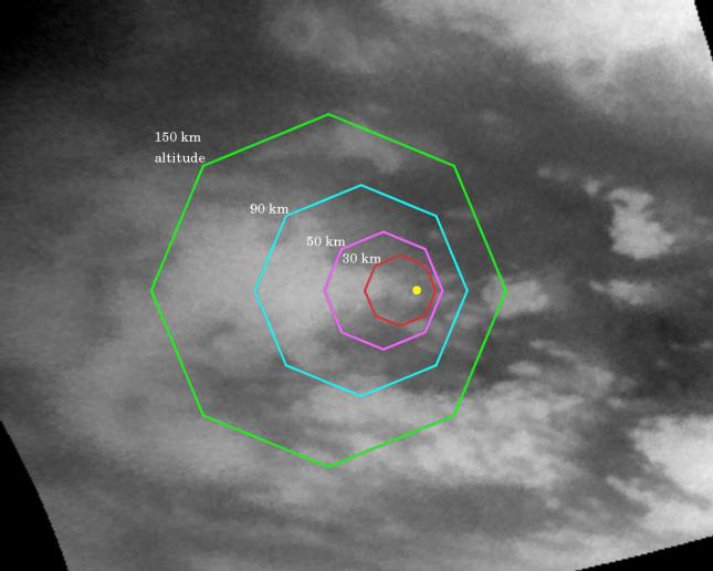 El descenso de hoy a la superficie de Titán por la sonda Huygens de la Agencia Espacial Europea fue el aterrizaje más distante jamás realizado por una nave espacial desde la Tierra. A las 10:13 UT (5:13 EST, 11:13 CET), Huygens entró en la atmósfera de la misteriosa luna grande de Saturno a una altitud de 180 kilómetros. Los astrónomos de radio informaron de la detección de señales de la sonda indicando que Huygens comenzó a desplegar una serie de paracaídas para controlar su descenso de 2 horas a través de la densa atmósfera de Titán. El punto de aterrizaje anticipado de Huygens está marcado por un punto amarillo en esta imagen de infrarrojo cercano de la nave espacial Cassini... pero se desconoce si le esperaba una superficie sólida o líquida. El octágono más exterior de los octágonos anidados mide aproximadamente 1.120 kilómetros de ancho. Los contornos están etiquetados por altitud e indican áreas de cobertura de los instrumentos de imagen de Huygens durante el descenso.
