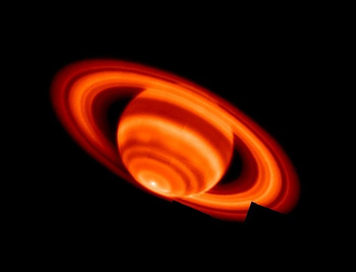This strange, false-color image of otherwise familiar planet Saturn shows temperature changes based on thermal infrared emission in the gas giant's atmosphere and rings. Recorded from the Keck I telescope on Mauna Kea, the sharp, ground-based picture of Saturn's southern hemisphere is a mosaic of 35 images. Based on the effects of sunlight during the southern summer season, general warming trends were anticipated. But a surprising result of the infrared image data is the a clear indication of an abruptly warmer polar cap and bright hot spot at Saturn's south pole. The warm south pole and hot spot may be unique in the solar system and a further exploration of the region is planned using instruments on the Cassini spacecraft. So how hot is Saturn's hot spot? The upper tropospheric temperature is a sweltering 91 Kelvin (-296 degrees Fahrenheit) at the pole.