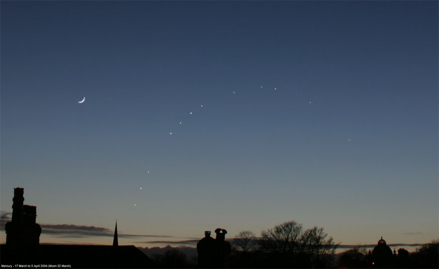 Have you ever seen the planet Mercury? This week might be a good time. Because Mercury orbits so close to the Sun, it never wanders far from the Sun in Earth's sky. If trailing the Sun, Mercury will be visible low on the horizon for only a short while after sunset. If leading the Sun, Mercury will be visible only shortly before sunrise. So at certain times of the year an informed skygazer with a little determination can usually pick Mercury out from a site with an clear horizon. Above, a lot of determination has been combined with a little digital trickery to show Mercury's successive positions during March of 2004. Each picture was taken from the same location in Leeds, England exactly 33 minutes after sunset. Over the next two weeks, Mercury will again be well placed for viewing above the western horizon at sunset, but by the third week in March it will have faded and dropped into the twilight.
