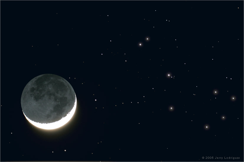 After parting with the Sun late last week, April's moon graced the early evening sky. Its slender, three-day-old crescent shares this lovely telescopic skyview with the nearby Pleiades star cluster. Here, the Moon's sunlit crescent is overexposed while the lunar terminator, or boundary between lunar night and day, is jagged with craters and mountains. Lunar surface features can also be seen in the dim lunar night illuminated by earthshine - light from sunlit planet Earth. The sister stars of the Pleiades are grouped at the right, but their alluring blue reflection nebulae, usually highlighted in telescopic images of the cluster, are washed-out in the much brighter moonlight.